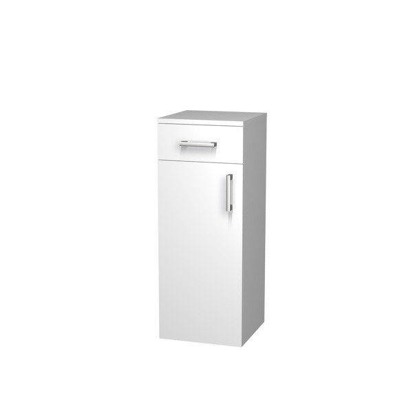 Závěsná střední koupelnová skříňka široká 35 cm s plnými dvířky, jednou zásuvkou a dvěma stavitelnými policemi je osazena celokovovými matnými úchytkami NiM/M. Dvířka skříňky mají panty vlevo (úchytku vpravo). Barevné provedení skříňky je dřevodekor 55. Dvířka i zásuvky doplňkových skříněk NY jsou vybaveny značkovým nábytkovým kováním (závěsy a pojezdy) Hettich s tlumeným dovíráním soft-closing.