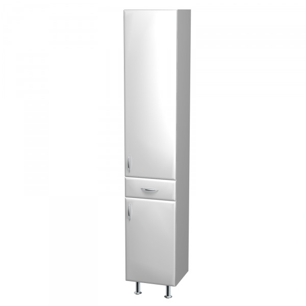Vysoká koupelnová skříňka na dvou nohách široká 35 cm s plnými dvířky, jednou zásuvkou a pěti stavitelnými policemi je osazena celokovovými matnými úchytkami NiM/M. Dvířka skříňky mají panty vpravo (úchytku vlevo). Barevné provedení skříňky je dřevodekor 99. Dvířka i zásuvky klasických doplňkových skříněk jsou vybaveny značkovým nábytkovým kováním (závěsy a pojezdy) Hettich bez tlumeného dovírání.
